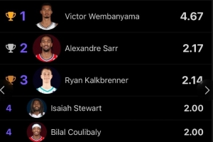 場均封蓋榜上,第二名薩爾約為2.2次。而總封蓋數上,文班6場比賽28次、第二名的卡爾克布倫納7場15次。