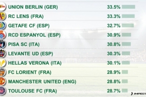 體育資訊11月4日訊 CIES統計了本賽季五大聯賽球隊攻防轉換階段占據進攻總時間的比例,并列出榜單,柏林聯合由守轉攻占比33.5%居首,朗斯33.3%、赫塔費32.7%二三位。