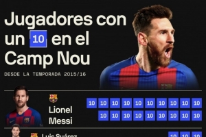 體育資訊11月22日訊 巴薩即將重返諾坎普,Sofascore統計了2015-2016賽季以來球員在諾坎普球場比賽中獲評10分的場次,并列出榜單,梅西19場居首。