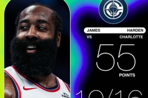 全場比賽,快船球星哈登出戰(zhàn)35分鐘,26中17,三分16中10得到55分3板7助攻1搶斷。