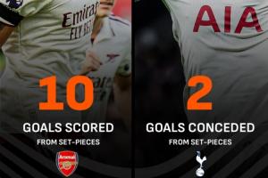 據統計,阿森納本賽季英超通過定位球攻入10粒進球,占總進球的50%,這兩個數字在英超聯賽均排第一。