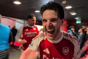 阿森納官方更新社媒動(dòng)態(tài),曬出賽后球員通道的視頻,槍手球員們?cè)诨氐礁率业穆飞蠎c祝勝利。