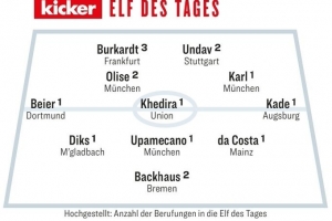 中場:拜爾(多特蒙德)、奧利塞(拜仁)、赫迪拉(柏林聯合)、倫納特·卡爾(拜仁)、卡德(奧格斯堡)
