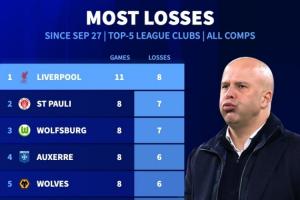 體育資訊11月24日訊 德轉統計了自9月27日以來五大聯賽球隊的輸球榜,利物浦以8場比賽高居榜單第一位。