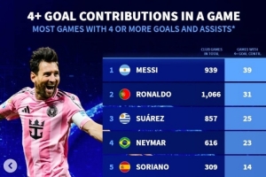 體育資訊11月24日訊 邁阿密國際在今日季后賽4-0完勝辛辛那提FC,梅西1射3傳獨造4球。《轉會市場》數據統計顯示,梅西也是俱樂部層面單場參與進球4+次數最多的球員。