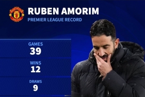 德國轉會市場統計了阿莫林執教曼聯的英超數據,他帶領曼聯參加39場英超比賽,戰績12勝9平18負,凈勝球-10,場均拿到1.15分。