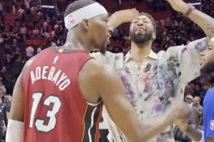 GIF-濃眉和阿德巴約擁抱 向觀眾臺獻飛吻 還尖笑