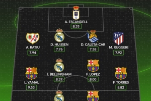 中場:拉明·亞馬爾(巴塞羅那,9.53分)、裘德·貝林厄姆(皇家馬德里,8.37分)、費(fèi)爾明·洛佩斯(巴塞羅那,8.00分)、費(fèi)蘭·托雷斯(巴塞羅那,8.82分)