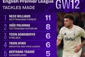 值得一提的是,11次成功搶斷既是諾丁漢森林升上英超之后的單場搶斷紀錄,也是本賽季英超球員單場最多。