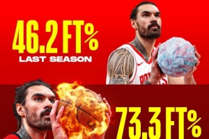 亞當斯上賽季罰球命中率46.2%,本賽季73.3%,進步幅度58.66%(46.2%×58.66%+46.2%=73.3%);生涯罰球命中率為53.3%