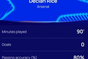 本場比賽賴斯發(fā)揮出色,傳球成功率80%,跑動覆蓋11.9km,賽后他當(dāng)選歐冠官方評選出的本場最佳球員。
