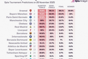體育資訊11月27日訊 本輪歐冠戰(zhàn)罷,數(shù)據(jù)網(wǎng)站OPTA也更新了本賽季歐冠奪冠概率,其中阿森納最被看好,具體奪冠概率如下: