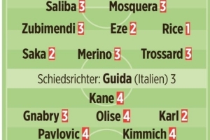 體育資訊11月27日訊 拜仁在本輪歐冠客場1-3不敵阿森納,《圖片報》在賽后為兩隊將帥評分。