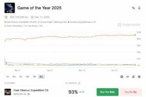 體育資訊11月27日訊 知名博彩網站Polymarket公布了各游戲獲得TGA年度最佳的可能性。其中《光與影:33號遠征隊》以93%幾率斷崖式領先所有其他游戲。