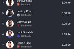 本賽季英超預期助攻排名(括號內為實際助攻):