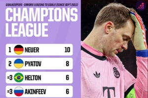 體育資訊11月27日訊 在本輪歐冠,阿森納3-1擊敗拜仁,諾伊爾出擊失誤導致丟球。數據網站OPTA也盤點了自2011年9月以來歐冠賽場門將因失誤導致丟球榜單,具體如下: