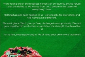 范戴克寫道:我們正面臨旅程中最艱難的時刻之一,但我們拒絕讓這一切定義我們。我們將從中崛起。我全心全意相信這支球隊。