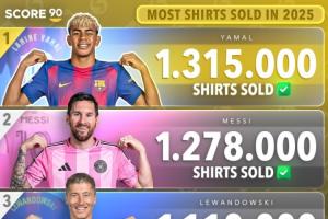 體育資訊11月28日訊 Score 90援引Euromericas Sport Marketing數據,統計了2025年截至目前世界足壇的球員球衣銷量榜,亞馬爾以131.5萬件排名第一,梅西第二,C羅位列第七。