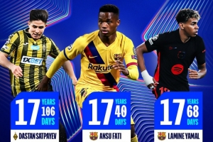 歐冠官方曬出最年輕進球者前三海報,其中法蒂以17零40天成為歐冠最年輕進球者,其次是17歲零68天的亞馬爾,排名第三正是薩特帕耶夫。