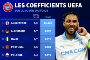體育資訊11月29日訊 德國轉會市場列出了本賽季歐戰積分排名,英超、德甲前兩位,意甲升至第三位。