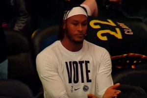 此役,雄鹿中鋒邁爾斯-特納重返步行者主場,但遭到老東家球迷的漫天噓聲,對此,特納面對鏡頭做了一個合上書的動作。