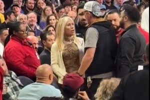 有球迷曬出視頻,昨日比賽中,有一位坐在湖人板凳席旁邊的女球迷疑似在不斷騷擾湖人球員,被多名保安強制請出場外。