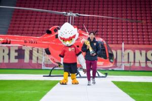 激動人心的奪冠視頻過后,大家的目光被靜候在內場的臨港捷運紀念版直升機吸引,儀式開始前,這架直升機載著王燊超和獎杯從川沙飛抵球場。這一環節不僅是榮耀的展示,更是俱樂部積極探索“低空+足球”體旅融合新范式的生動實踐。隨后,王燊超與俱樂部總經理沙良昌共同將新賽季冠軍獎杯安放于柱頂,與三座往屆火神杯組成“冠軍獎杯矩陣”,將現場氛圍推向高潮。