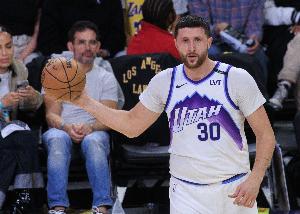 首節(jié)比賽,爵士中鋒努爾基奇發(fā)揮出色,進攻端能攻能傳且彈無虛發(fā),他出戰(zhàn)7分鐘,4中4,三分2中2拿到10分4籃板3助攻。
