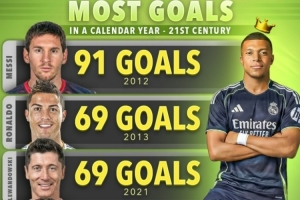 體育資訊12月1日訊 數據網站Score90盤點了21世紀以來單一自然年進球榜,其中梅西91球高居榜首,姆巴佩今年60球第6,具體如下: