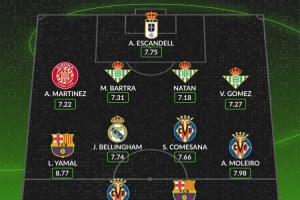 中場:亞馬爾(巴塞羅那,8.77分)、貝林厄姆(皇家馬德里,7.74分)、桑蒂·康薩尼亞(比利亞雷亞爾,7.66分)、阿爾貝托·莫萊羅(比利亞雷亞爾,7.98分)
