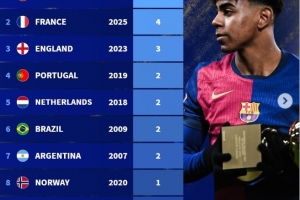 體育資訊11月5日訊 巴黎圣日耳曼小將杜埃贏得了2025年金童獎(jiǎng),德轉(zhuǎn)盤點(diǎn)了各國球員贏得金童獎(jiǎng)次數(shù),西班牙以5次居首。