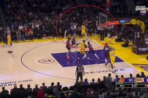 末節9分48秒,時間靜止,湖人的進攻時間也鎖定在了15秒,這個回合最終文森特轟進底角三分