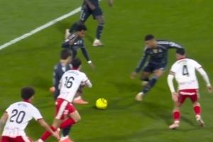 西甲第14輪,皇馬客場1-1戰平赫羅納,讀秒階段皇馬獲得絕殺機會,貝林厄姆禁區橫敲,正對球門的羅德里戈調整步點準備射門,這時正對來球但側對球門的姆巴佩半路殺出,轉身兜射打偏。