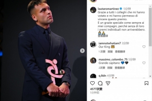 勞塔羅社媒曬出領獎的照片,并寫道:“感謝所有投票支持我的球員,是你們讓我獲得了這個獎項。”
