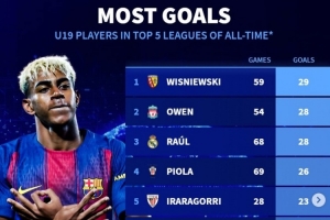 體育資訊12月2日訊 巴薩在本賽季西甲領跑積分榜,亞馬爾14場貢獻7球8助攻,其中西甲10場5球7助攻。數據統計顯示,他也已經是五大聯賽歷史U19射手榜前十。