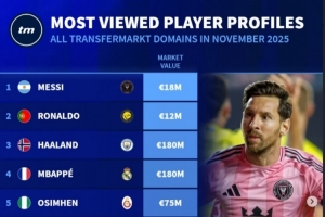 體育資訊12月3日訊 德轉(zhuǎn)列出了11月份球員頁(yè)面瀏覽量排名,前三依次為梅西、C羅、哈蘭德。