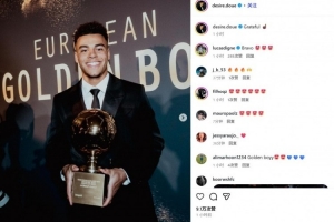 體育資訊12月3日訊 在《都靈體育報》主辦的歐洲金童獎頒獎典禮上,杜埃領取了2025年金童獎杯。