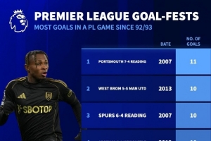 體育資訊12月3日訊 英超第14輪比賽,曼城客場5-4擊敗富勒姆。德國轉會市場指出,英超歷史上只有6場比賽的進球數量多于此役。