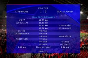 體育資訊11月05日訊 利物浦本輪歐冠1-0擊敗皇馬。賽后官方跑動數據出爐。