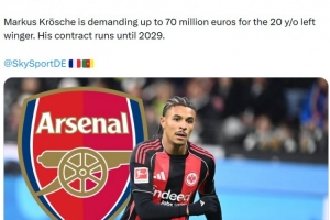 報道稱阿森納已經明確展現出對這位20歲左邊鋒的興趣,有意在夏窗引進,法蘭克福也對此已經知悉。法蘭克福體育總監馬克爾斯·克羅斯切對球員要求高達7000萬歐元的轉會費。