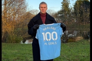 哈蘭德本人更新社媒,曬出自己的英超百球曼城特制紀念球衣。