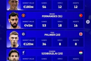 B費(曼聯,31歲,葡萄牙):身價4500萬歐,53場,18球,16助攻