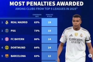 2025年五大聯(lián)賽俱樂部各項(xiàng)賽事獲得點(diǎn)球榜及命中率: