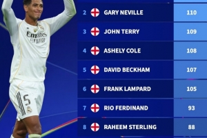 體育資訊11月5日訊 在本輪歐冠,利物浦1-0擊敗皇馬。貝林厄姆完成生涯50場歐冠里程碑,德轉也盤點了英格蘭球員歐冠出場次數榜,具體如下:
