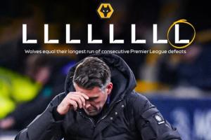 本賽季英超,狼隊14輪未嘗勝績,2平12負僅得2分,五大聯賽“獨一檔”,意甲(維羅納)和德甲(美因茨)的墊底球隊都有6分,西甲(皇家奧維耶多)和法甲(歐塞爾)的墊底隊拿到了9分。
