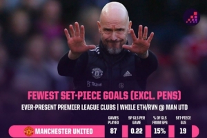滕哈赫共率曼聯(lián)踢了87場英超比賽,通過定位球打進19球,平均每場0.22球,定位球進球占球隊總進球數(shù)僅為15%。本賽季,曼聯(lián)13輪英超比賽已經通過定位球打進10球,和踢了14輪的阿森納持平。曼聯(lián)本賽季場均可通過定位球打進0.77球,定位球進球數(shù)占球隊總進球數(shù)的47.6%。