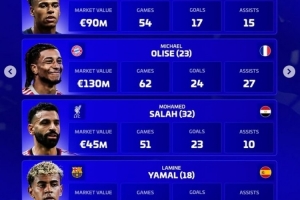 奧利塞(拜仁,23歲,法國):身價1.3億歐,62場,24球,27助攻