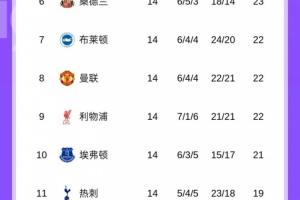 曼聯前14輪排名: