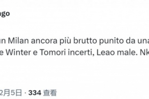 米蘭跟隊記者隆戈在社交媒體上寫道:“一場糟糕的比賽,米蘭表現更是糟糕,被更具求勝信念的拉齊奧懲罰。德溫特和托莫里表現不穩,萊奧發揮不佳,至于恩昆庫——看過比賽的人都會問,他到底在哪里?”