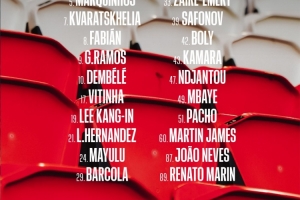前鋒:7-克瓦拉茨赫利亞、9-貢薩洛·拉莫斯、10-登貝萊、19-李剛仁、29-巴爾科拉、47-恩賈恩圖、49-姆巴耶